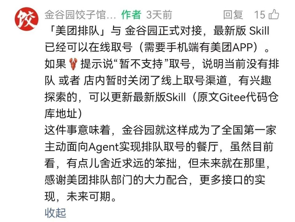 此外,美团排队与金谷园正式对接,最新版SKILL已经可以在线取号(需要手机端有美团APP)。如果“龙虾”提示说“暂不支持”取号,说明当前没有排队或者店内暂时关闭了线上取号渠道。